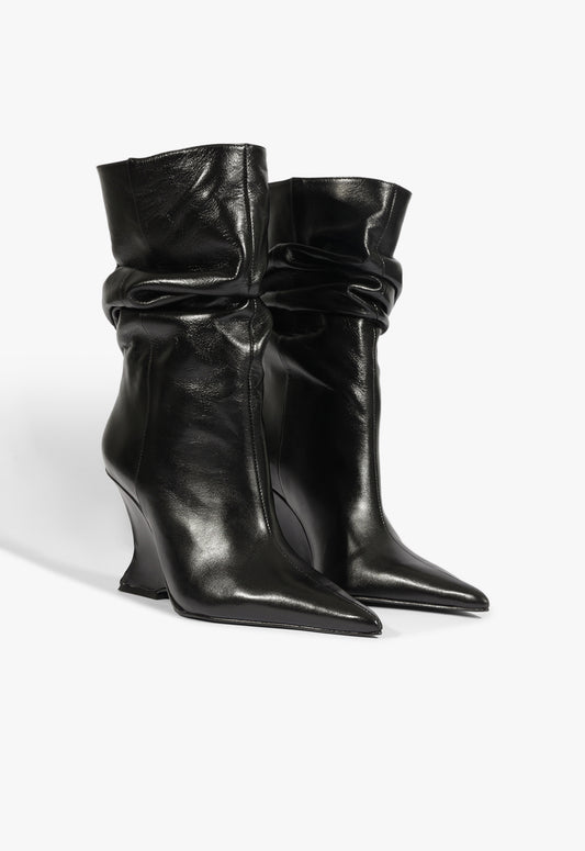 Essentials – Tall black boots with a textured, slightly glossy finish standing upright against a clean white wall. The design is structured and elegant, giving a timeless, essential wardrobe feel. Essentials – Tall black boots with a textured, slightly glossy finish standing upright against a clean white wall. The design is structured and elegant, giving a timeless, essential wardrobe feel.