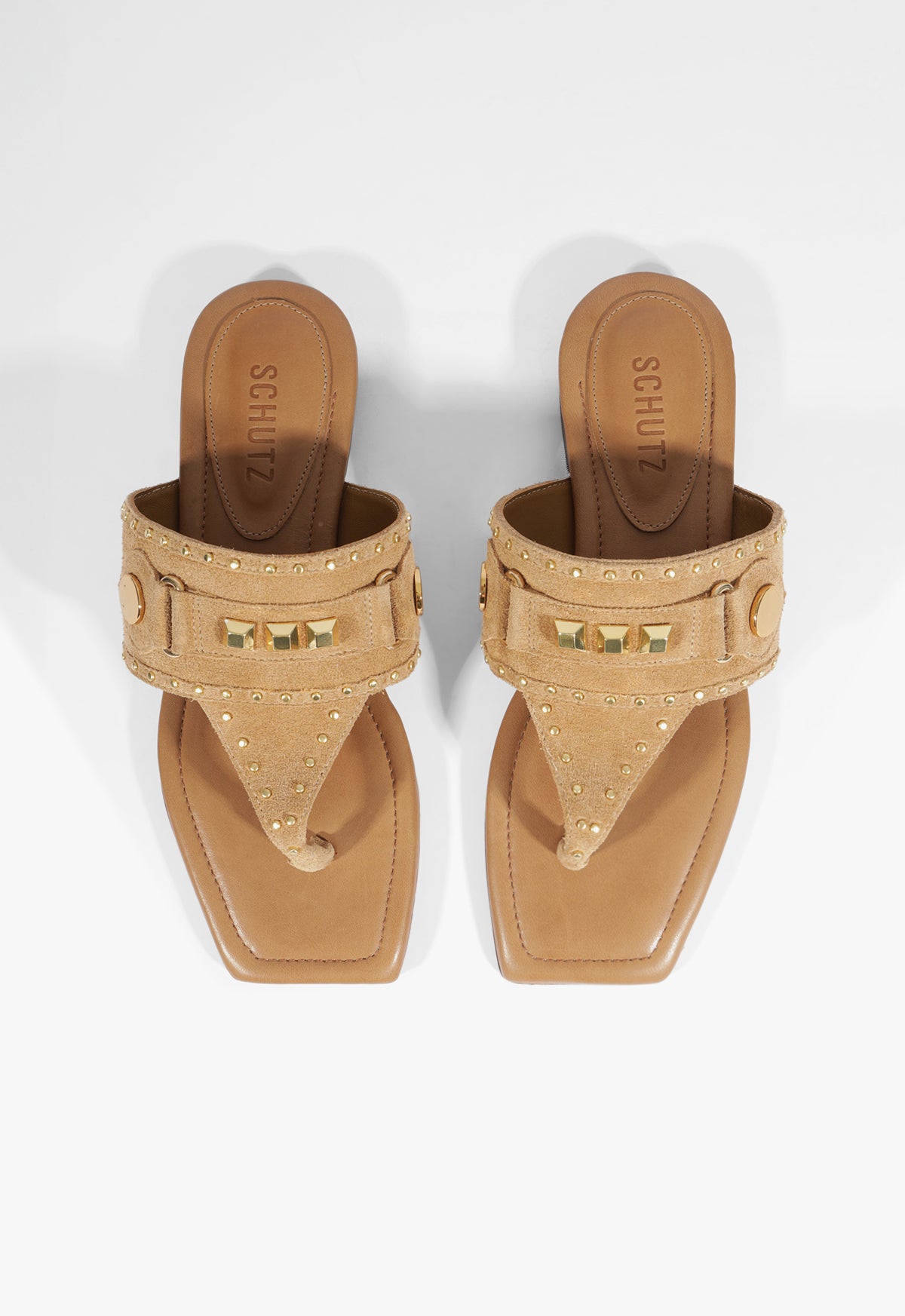 Edge meets ease in the Aria sandal, where bold hardware and standout structure come standard. Every detail, from its thick strap to the sharp square toe, delivers an edge. Gold-tone studs and statement hardware give it undeniable energy, and the textured finish adds a touch of grit. Wear a pair of Arias to downtown brunch or your next off-duty coffee run.