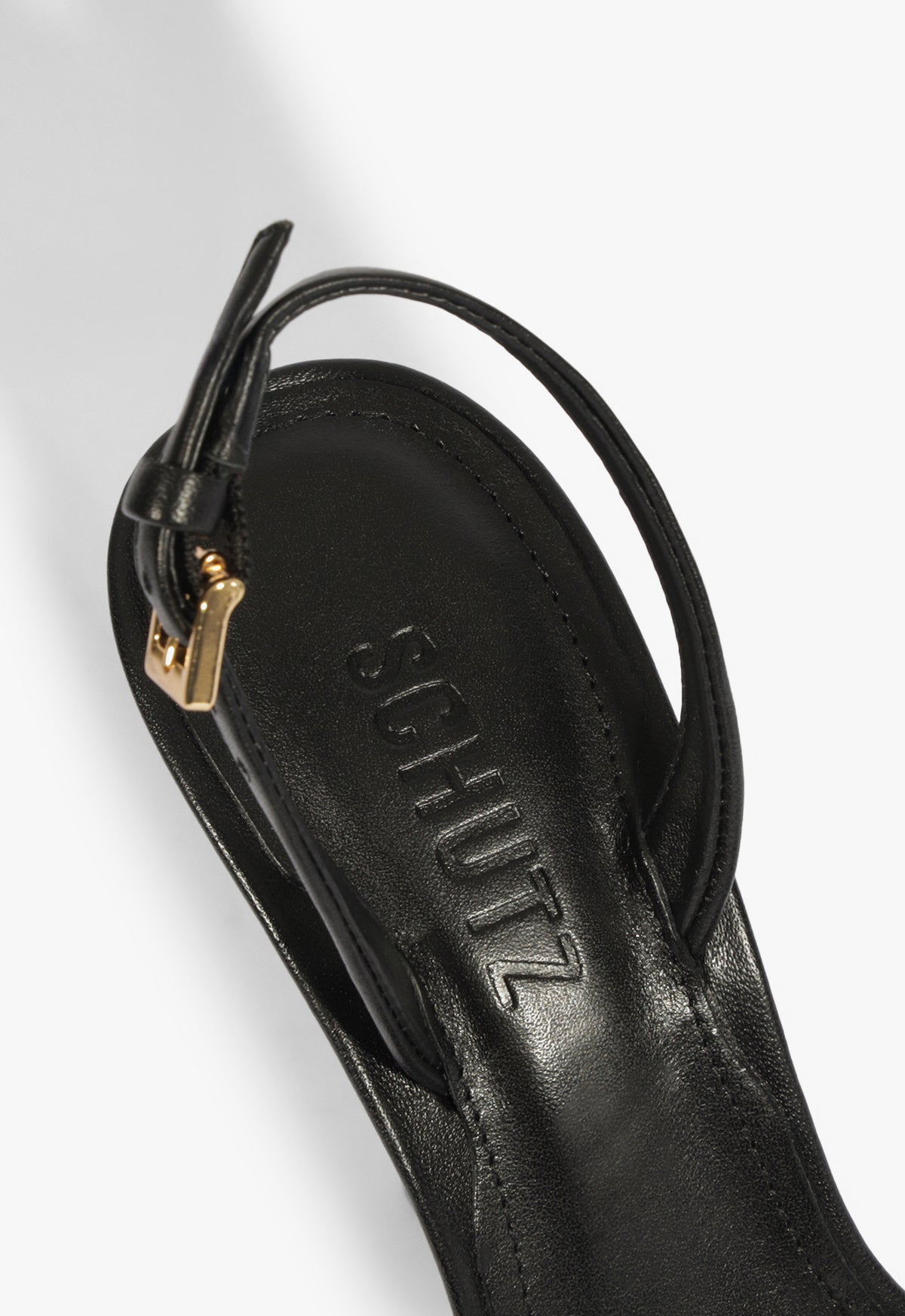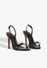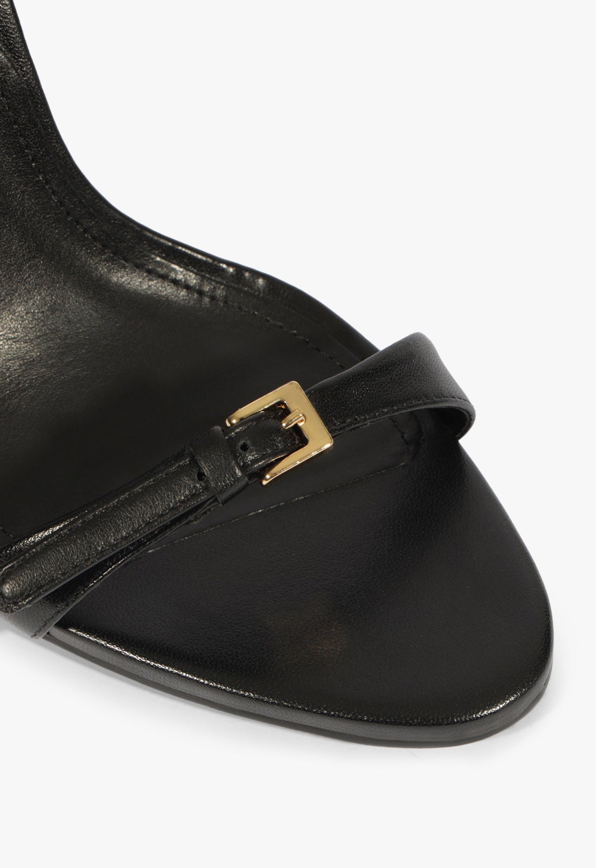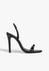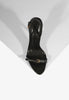 The Aurora sandal is all about clean lines and confident curves. Crafted in smooth black leather, it wraps the foot with minimal finesse. A slim strap and a delicate ankle buckle keep the silhouette sharp. Rising on a high slender stiletto heel, this pair is made for leg-lengthening moments, perfect for wearing with an evening dress or oversized tailoring.
