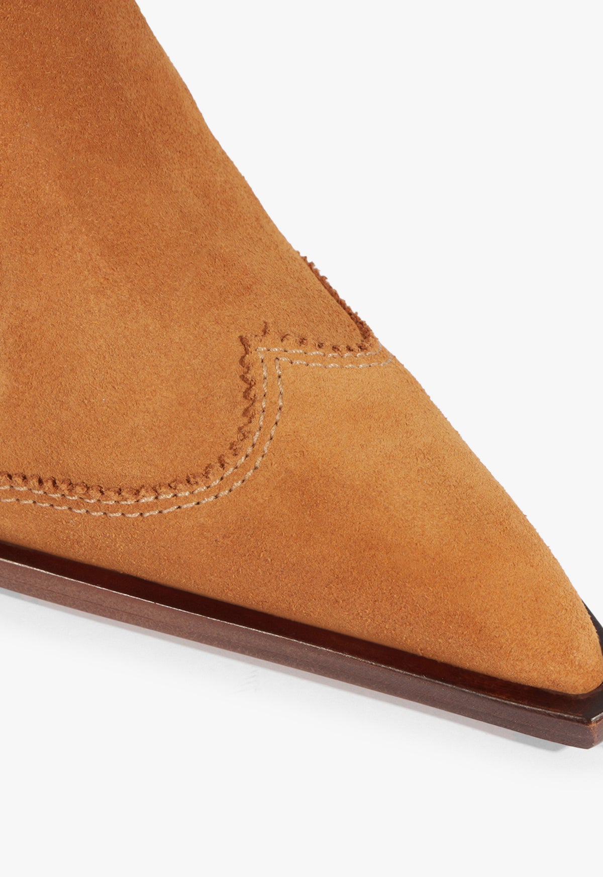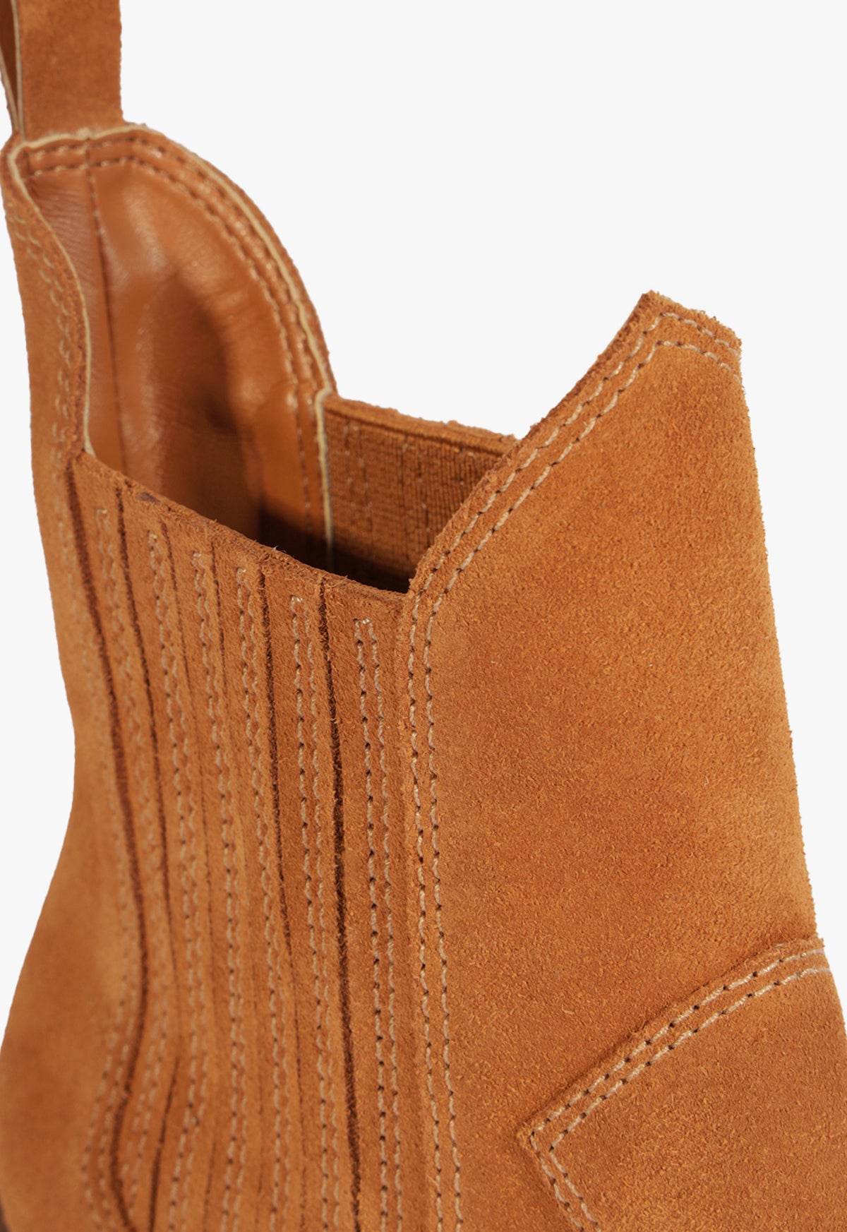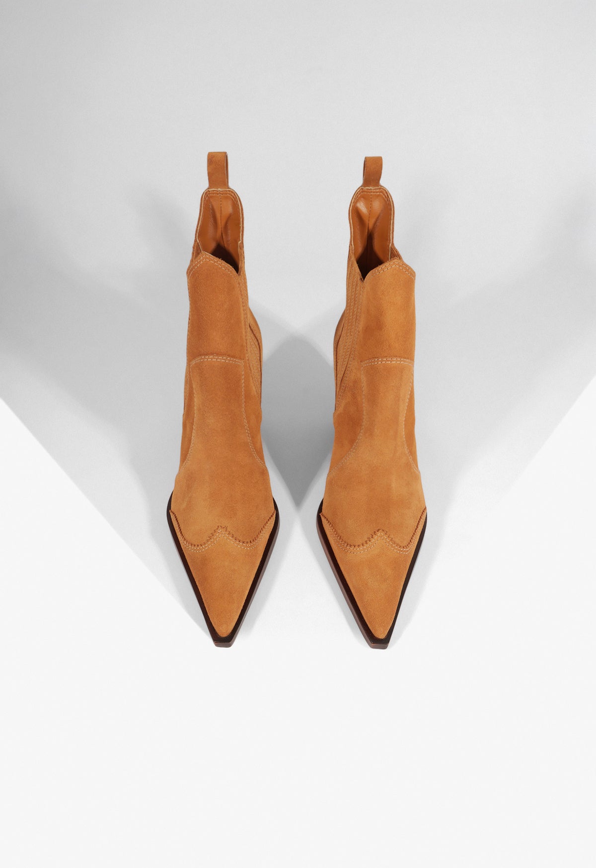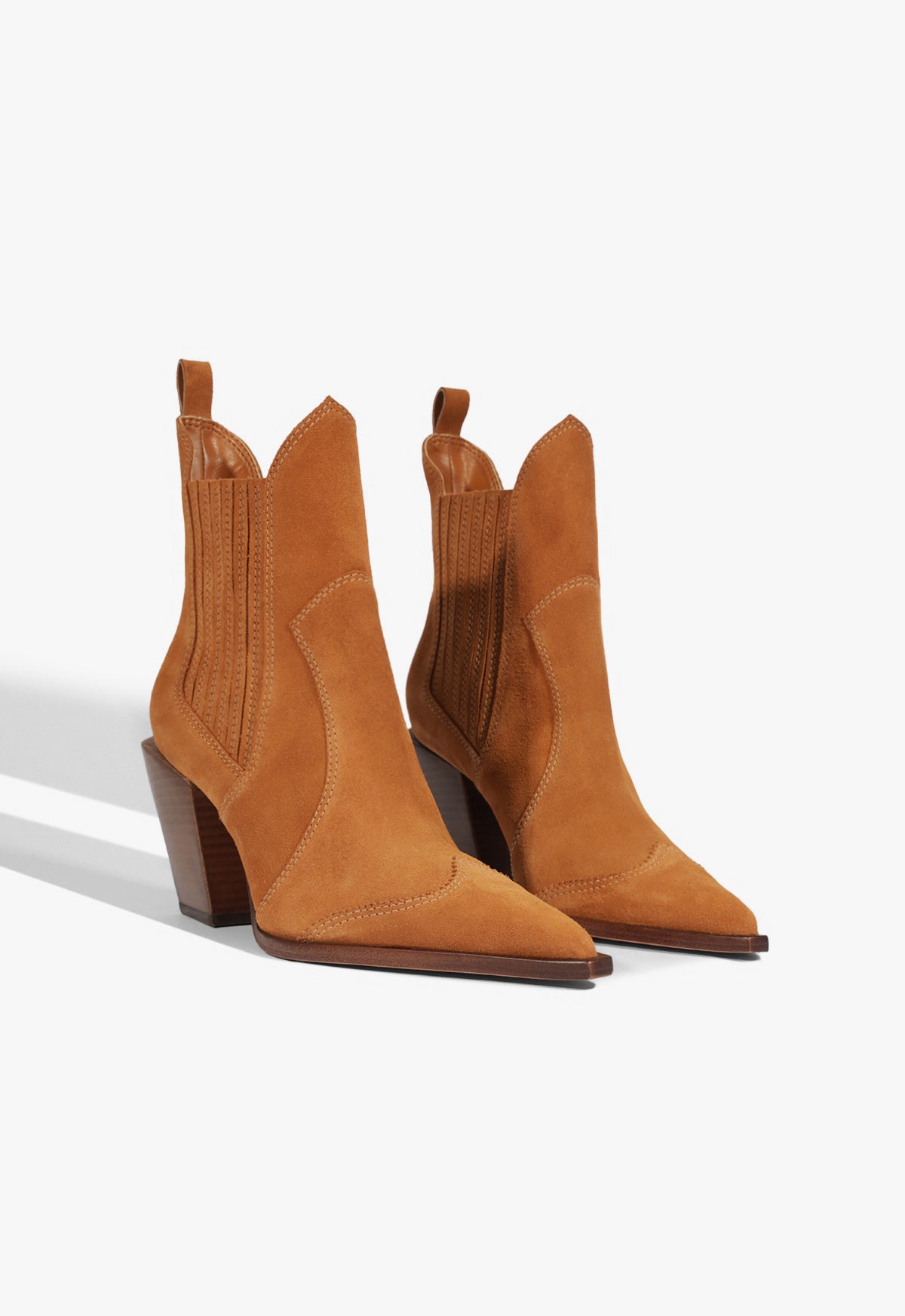 Dolly in suede is the desert soul of your fall wardrobe—warm, worn-in, and ready for anything. Its bold heel and pointed toe accentuate the drama, while the medium brown suede maintains an earthy and cool tone. The pull-on tabs and stretch sides make them easy to put on and take off. Style them with layered knits or your favorite cutoff shorts and a blazer. It’s that blend of rustic and runway that makes them a standout.