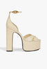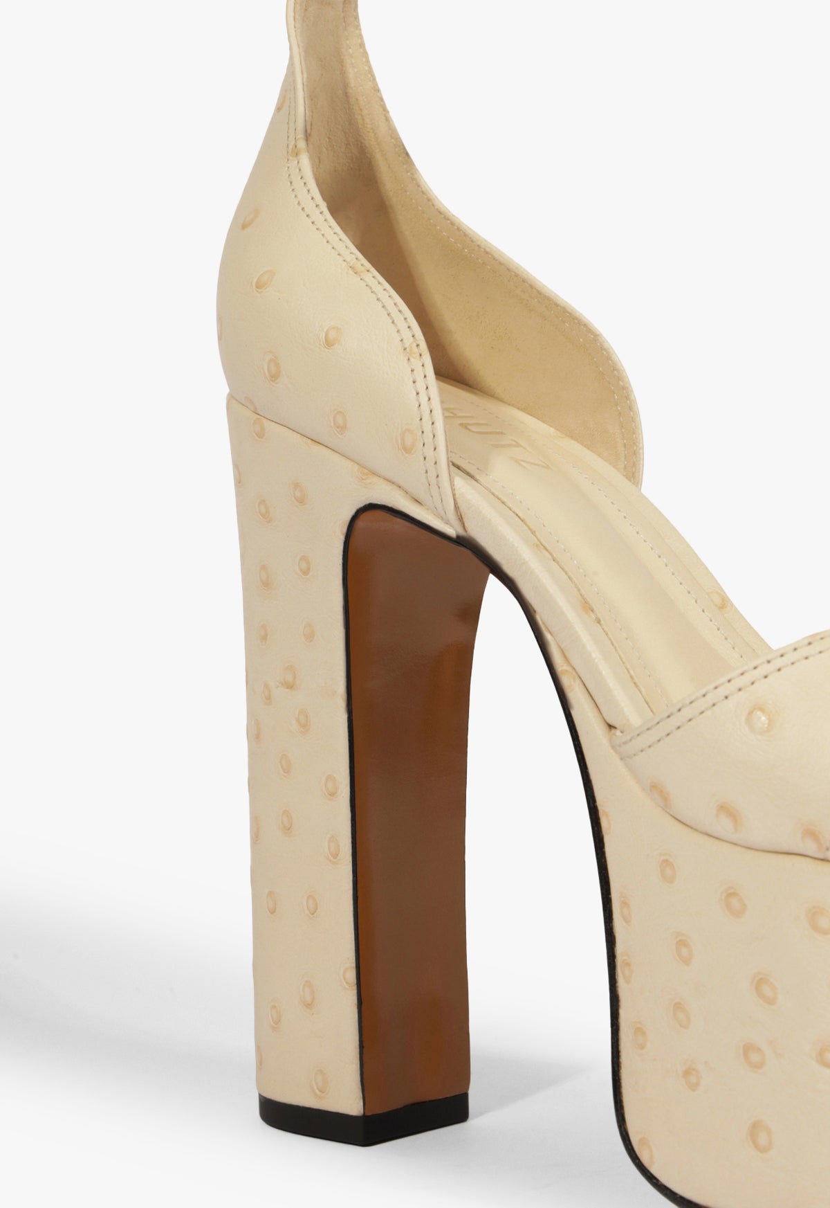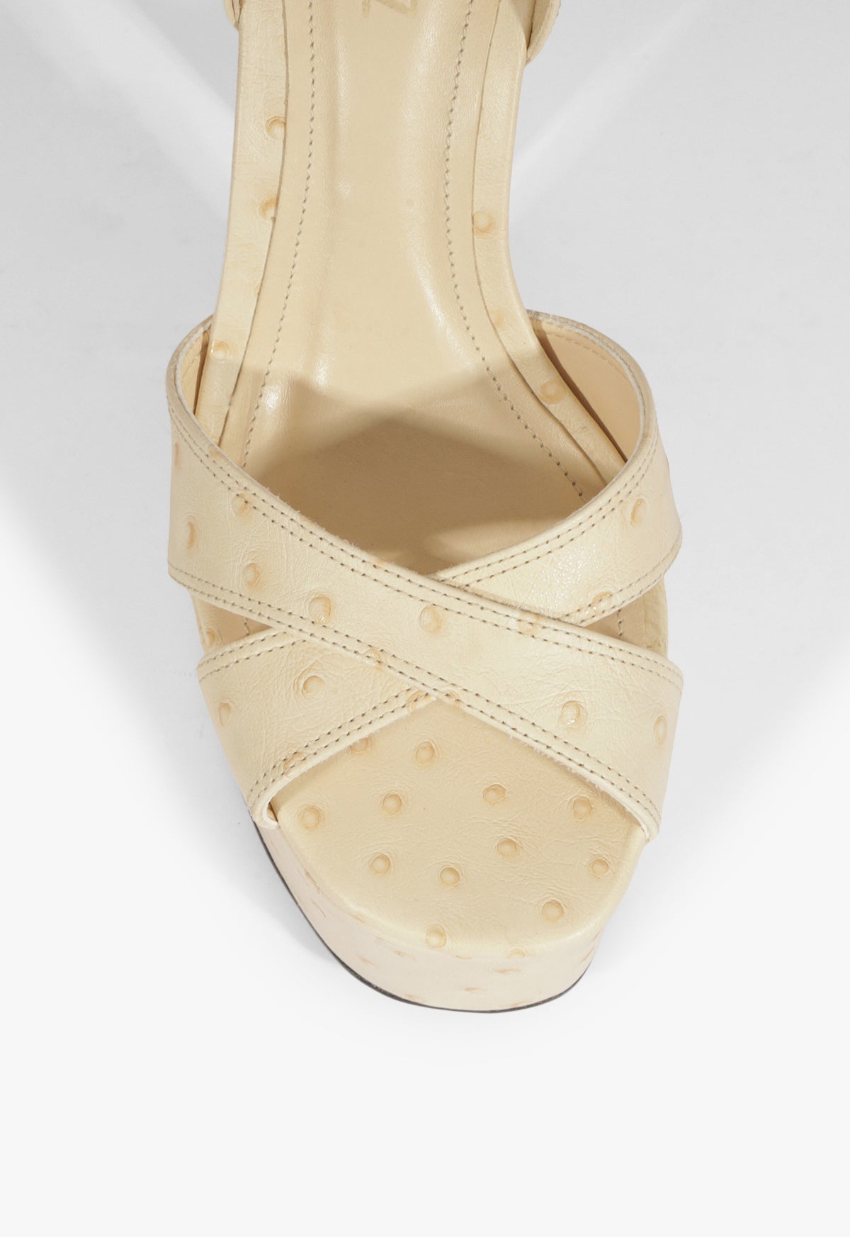 Towering and unapologetic, Jolene takes the platform sandal to new levels. The sculpted heel and stacked sole bring serious height, while the minimalist straps keep it sleek. Crafted with eggshell ostrich-embossed leather and built for impact, she’s the shoe version of a power pose. Pair with a bodycon, denim, or dramatic tailoring because Jolene shows up loud—and always lands.