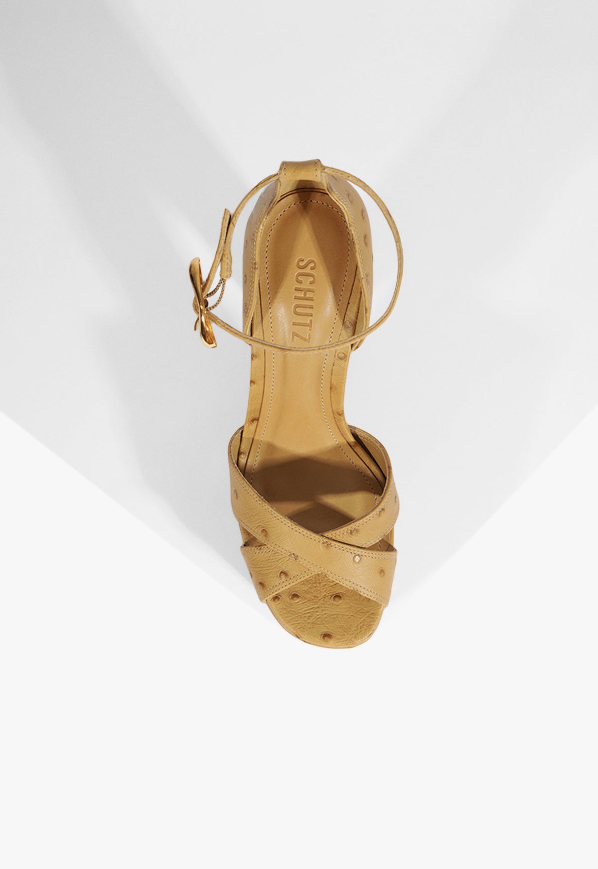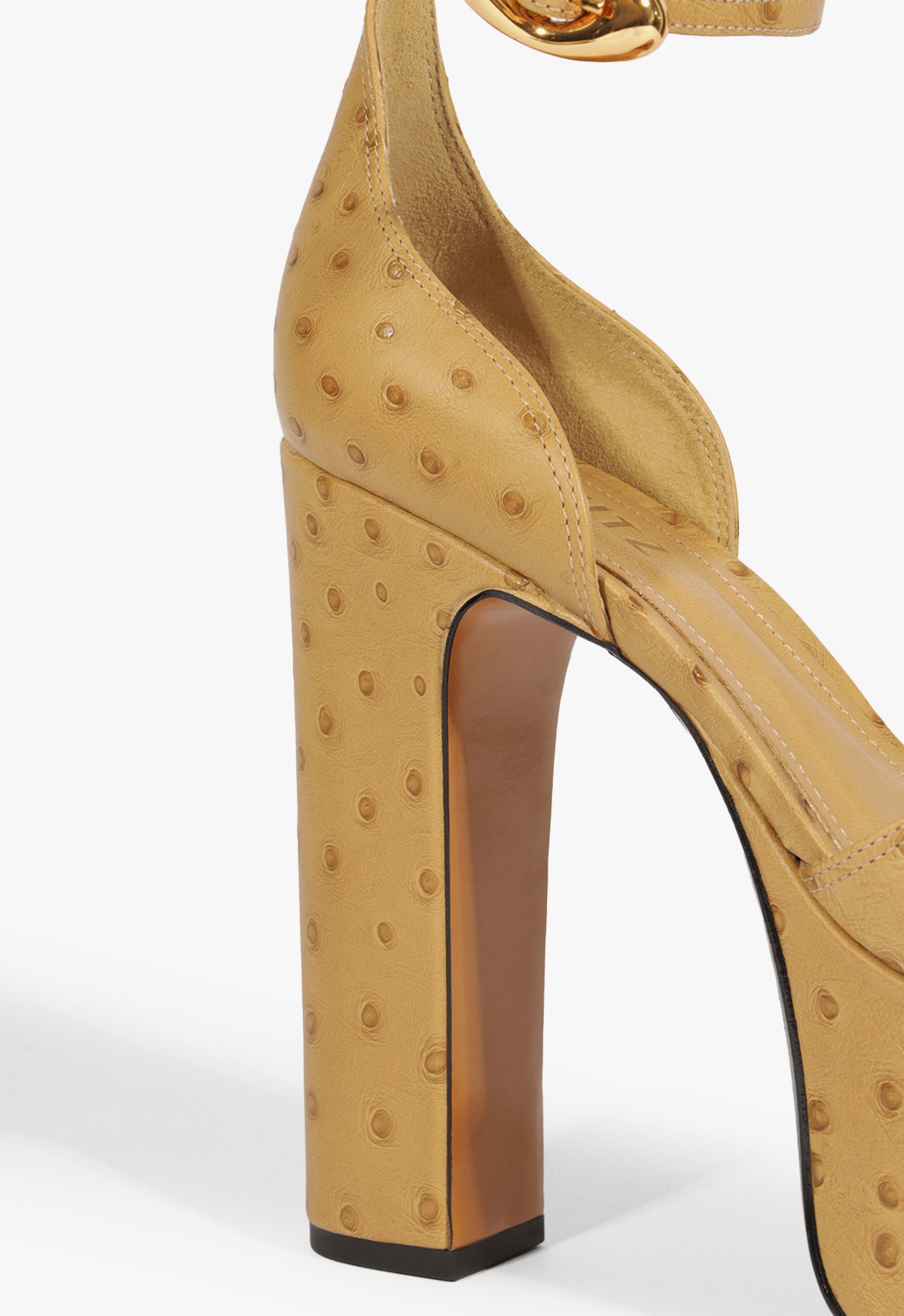 Towering and unapologetic, Jolene takes the platform sandal to new levels. The sculpted heel and stacked sole bring serious height, while the minimalist straps keep it sleek. Crafted with ostrich-embossed leather and built for impact, she’s the shoe version of a power pose. Pair with a bodycon, denim, or dramatic tailoring because Jolene shows up loud—and always lands.
