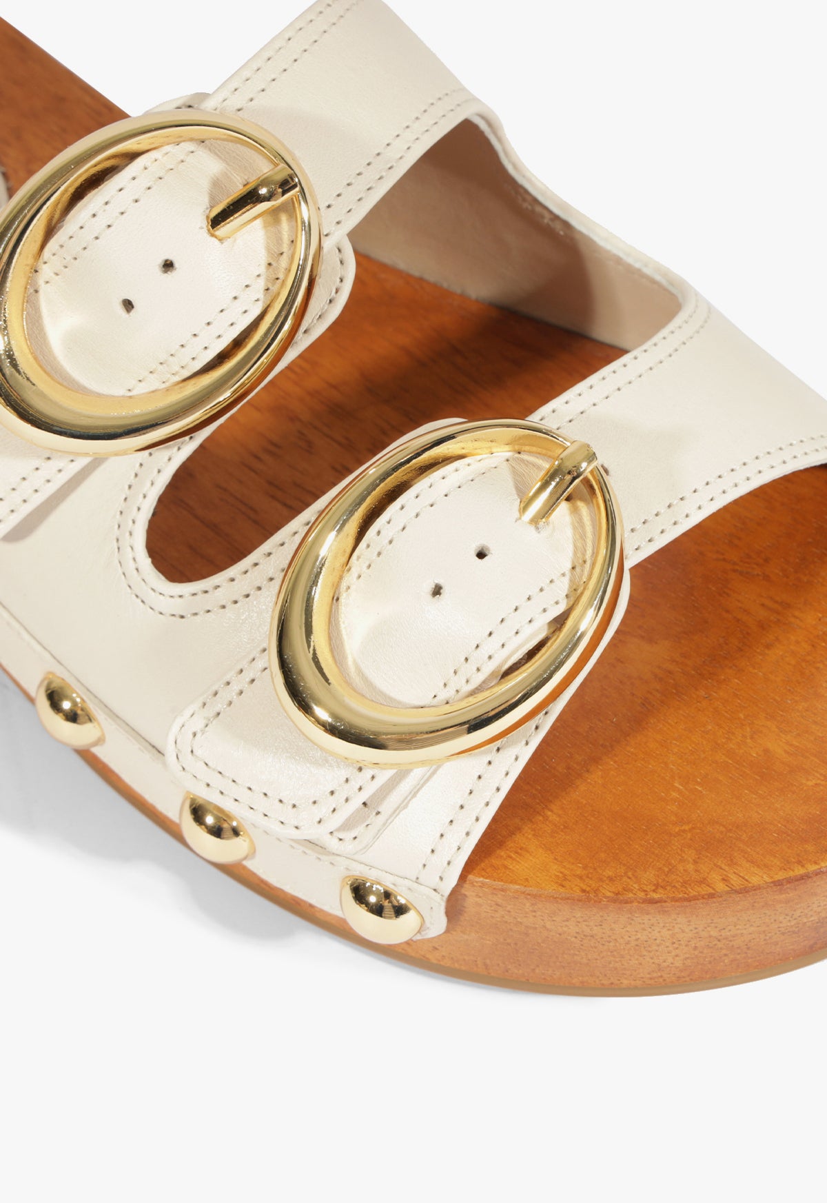 Juno is the ultimate sandal for turning casual Summer plans into cool moments. Chunky buckles and studded details serve a serious attitude with every step. The wooden low-block heel adds a crafted feel while keeping it light and easy. These Junos are for everything, from music festivals to casual Sunday hangs with the girls.