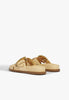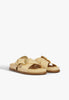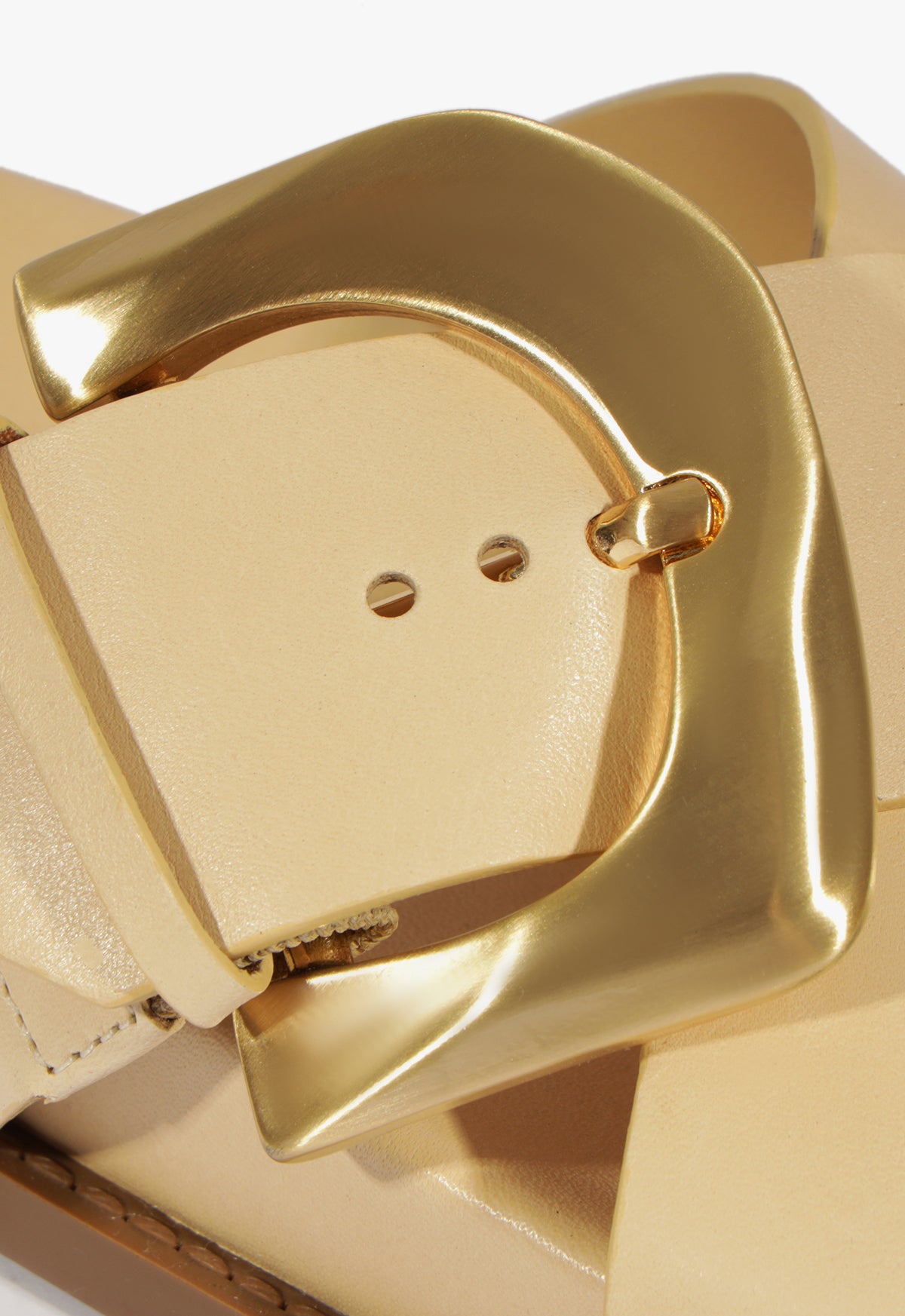 Designed for days that demand ease without sacrificing style, the Lois sandal pairs a structured silhouette with bold detailing. Wide leather straps crisscross over the foot, secured by a statement gold buckle that catches the light. The flat sole keeps things grounded while the luxe materials do the talking. Every step with a pair of Lois' says, "I've got this."