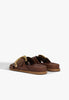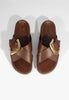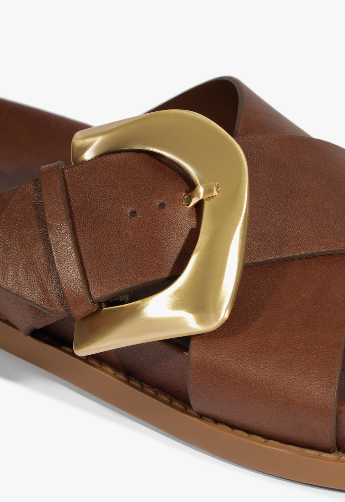 Designed for days that demand ease without sacrificing style, the Lois sandal pairs a structured silhouette with bold detailing. Wide leather straps crisscross over the foot, secured by a statement gold buckle that catches the light. The flat sole keeps things grounded while the luxe materials do the talking. Every step with a pair of Lois' says, "I've got this."