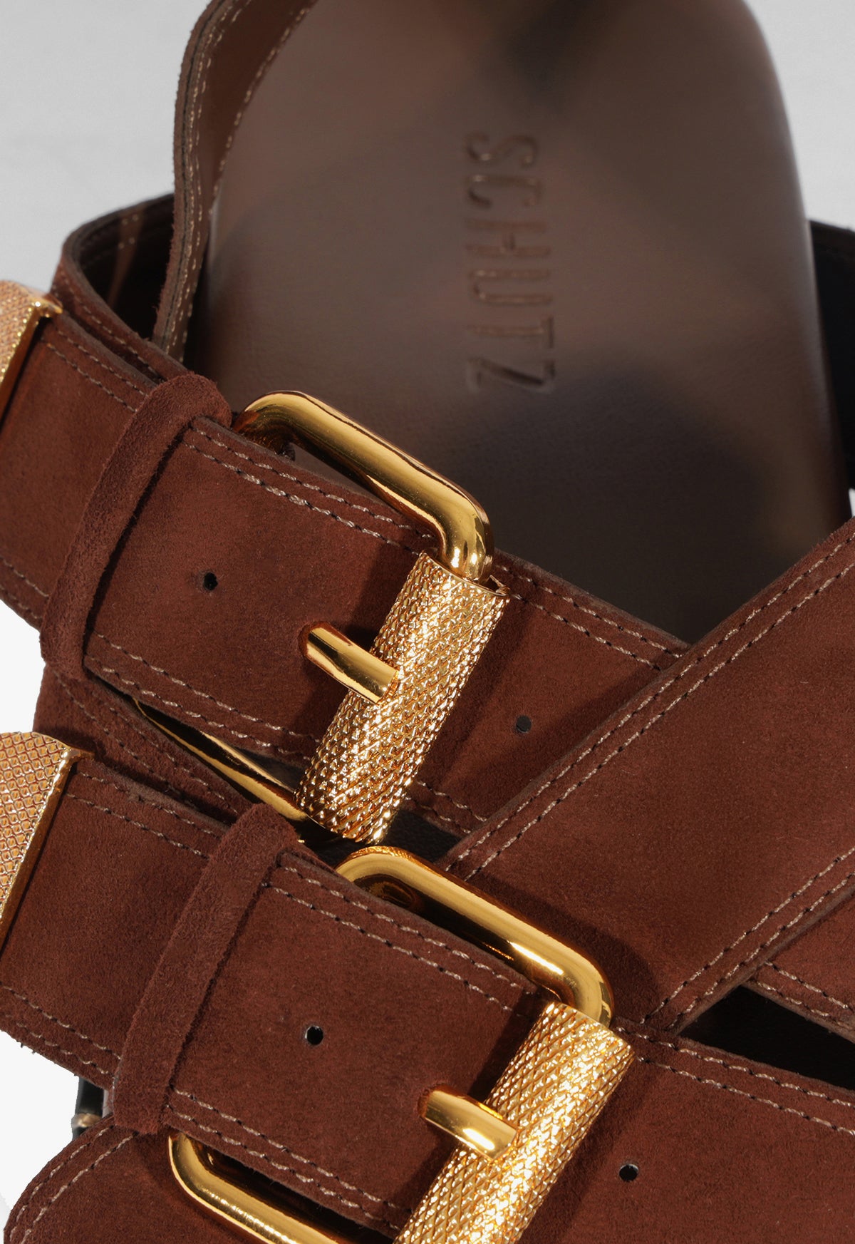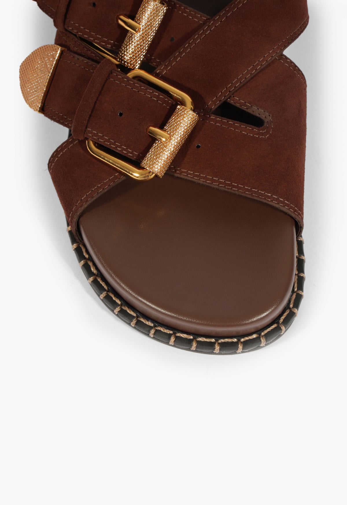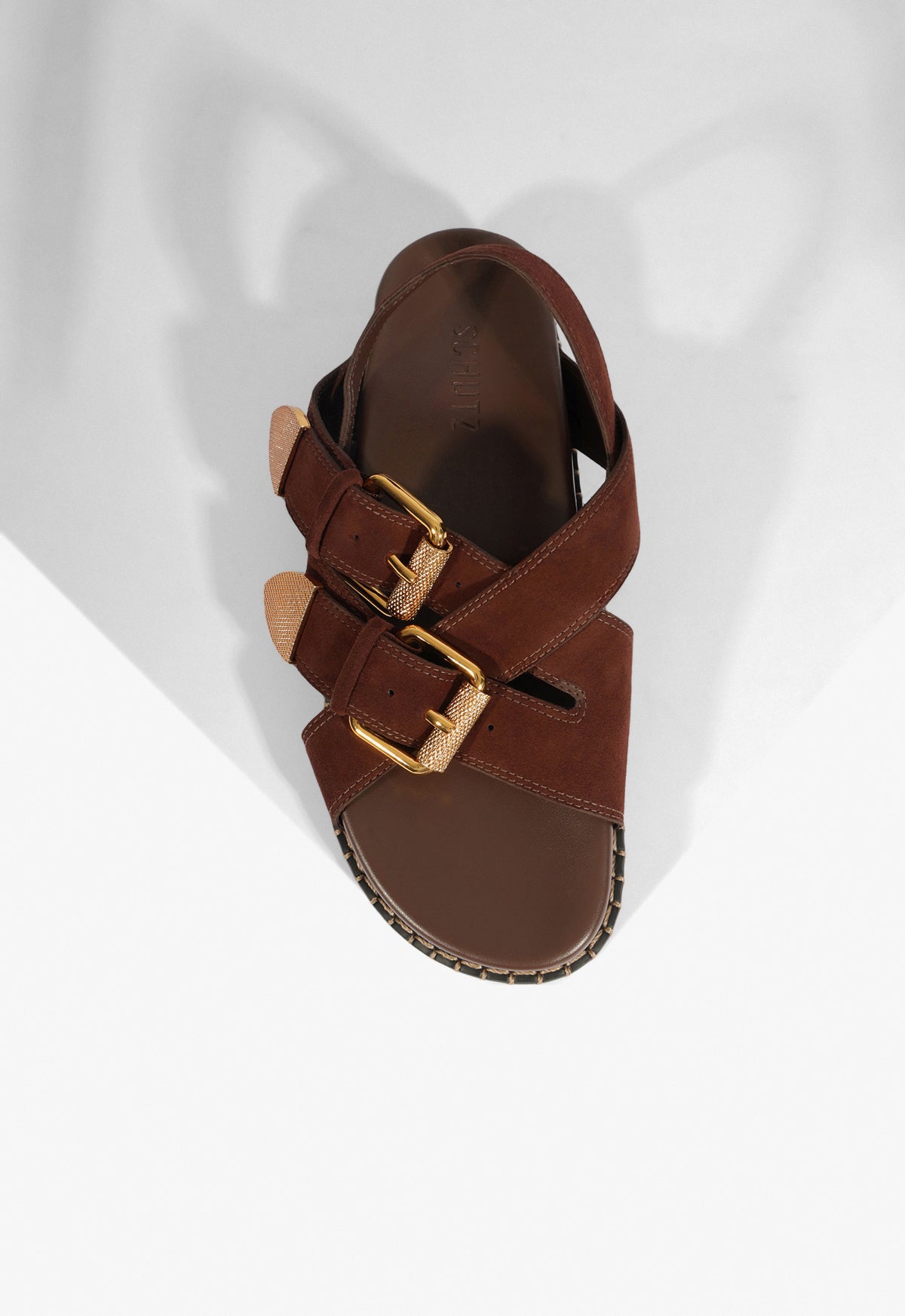 Flat but far from basic, Patsy brings a bold stance with its double-strap design and chunky gold hardware. The deep brown suede and contrast underlays add dimension, while the open back and sling strap make it easy to wear. She’s your answer to “cool without trying.” Style the Patsys with a maxi skirt or off-duty denim to obtain a grounded, confident, and always-ready look.