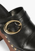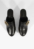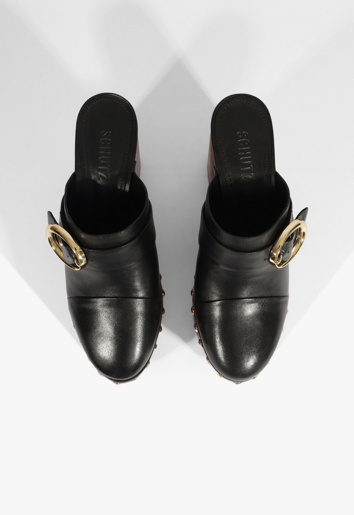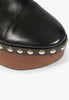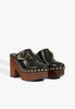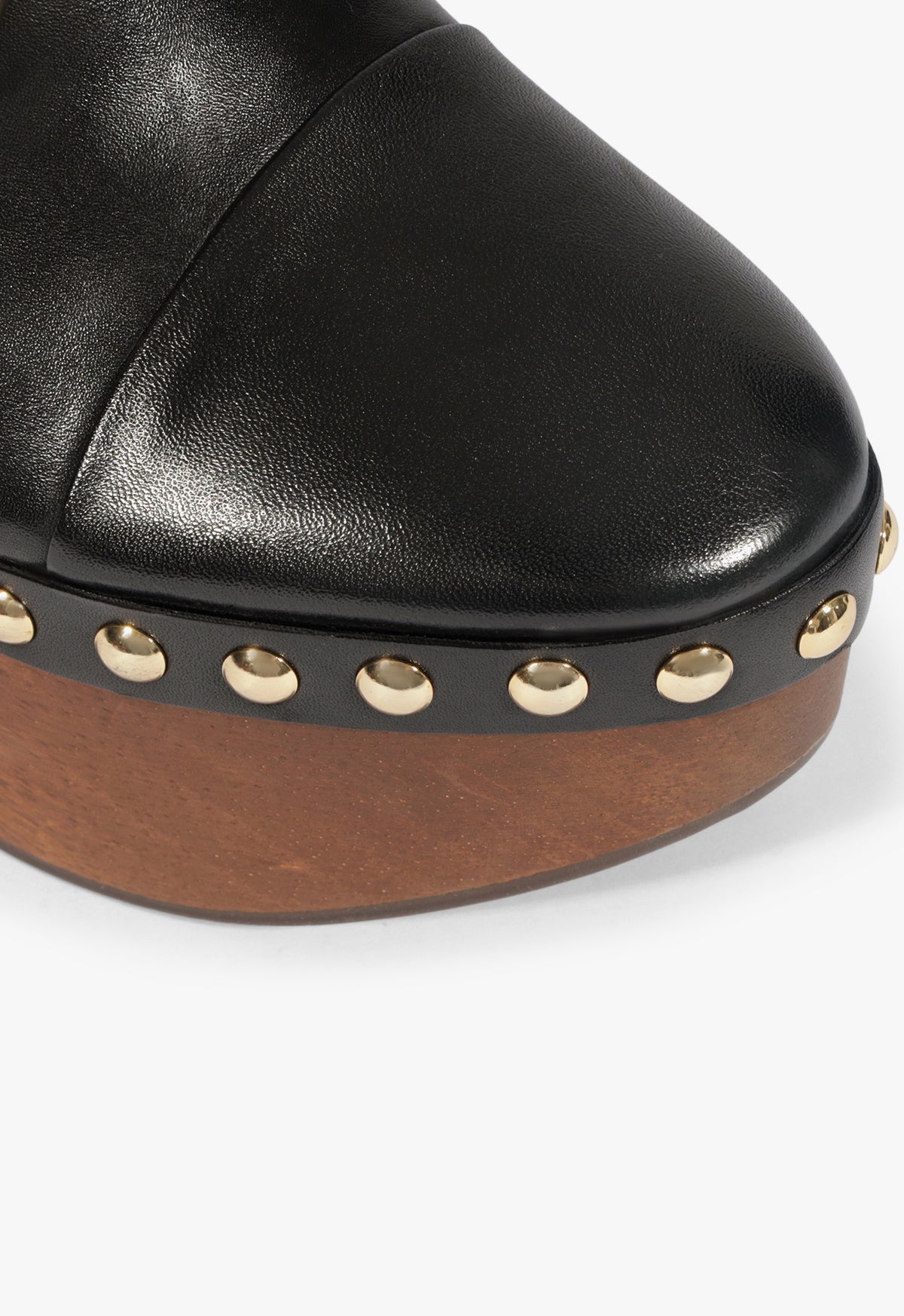 Piper takes the classic clog and elevates it with sculptural wood soles, metallic stud work, and a bold black leather upper. A round gold buckle adds polish to the vibe. These were made for stomping through your day with zero apologies. Style them with flowy dresses, tailored sets, or raw-hem denim.