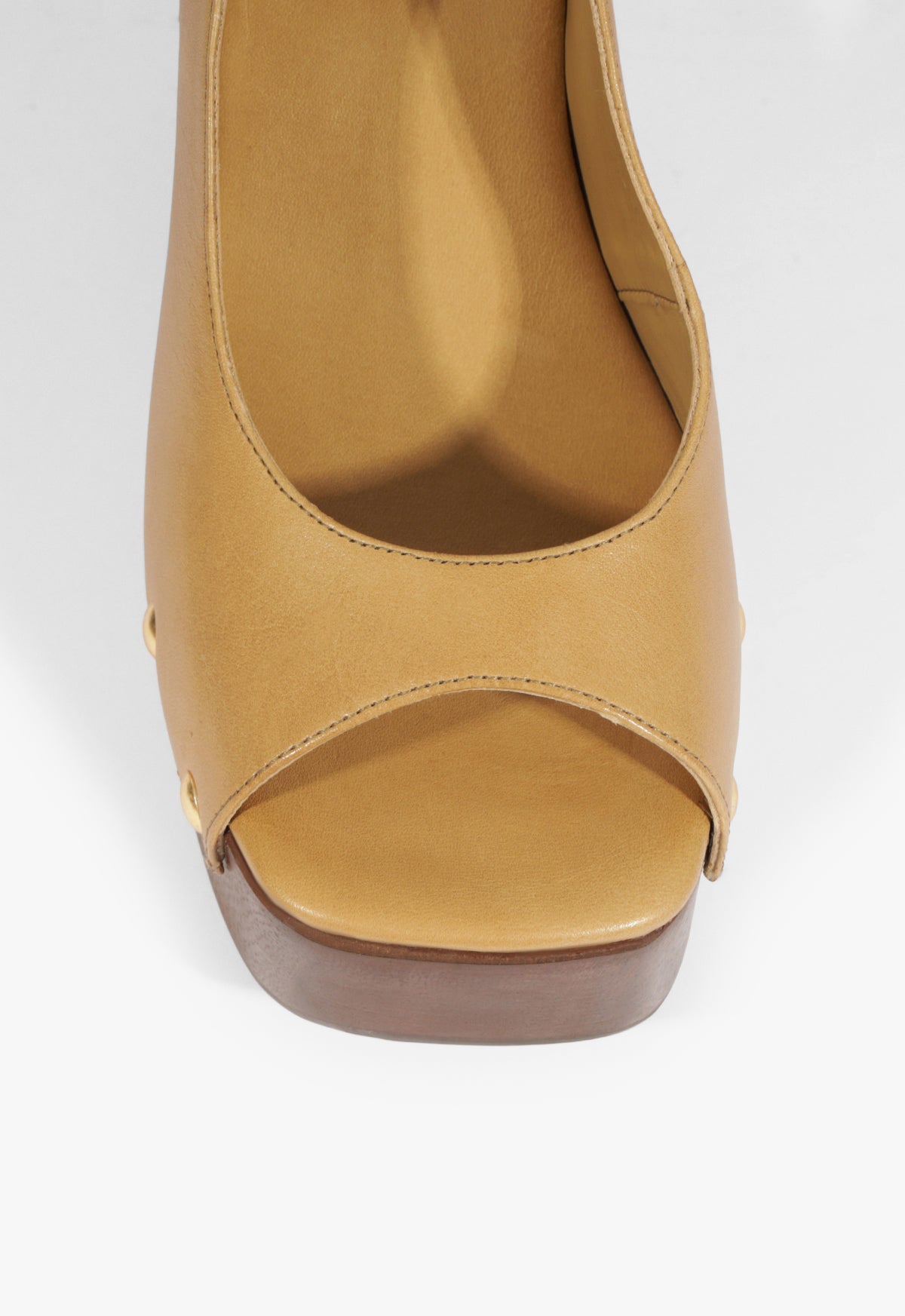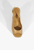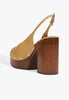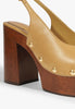 The Rose sandal blends soft fig-toned leather with bold wood for a platform that’s anything but shy. Gold studs wrap the base, adding just the right flash of hardware. The chunky block heel brings serious height, balanced by a walkable platform. A slingback strap keeps things grounded. Pair it with structured separates, or go full retro with wide-leg denim.