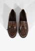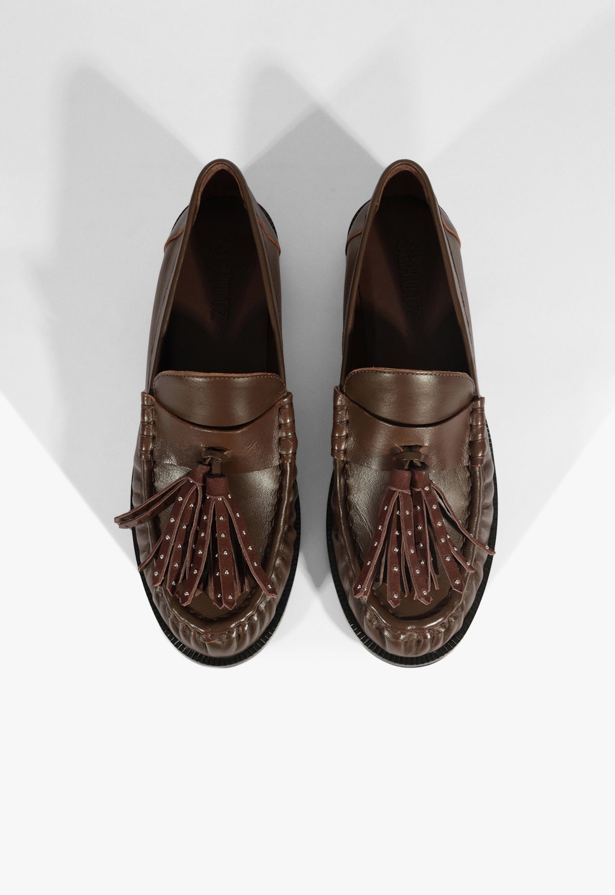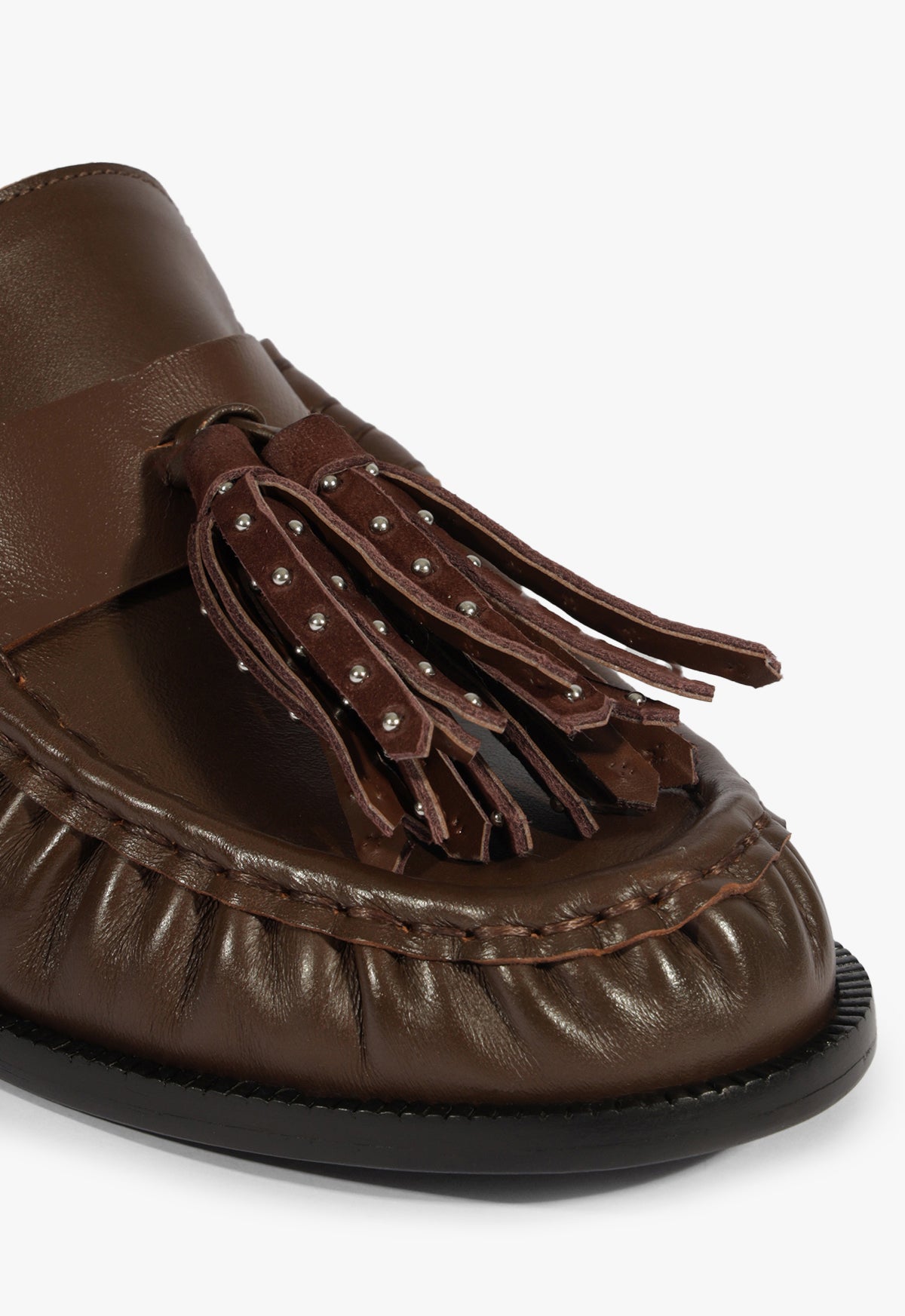 Crafted from root-brown leather, the Tilly flat blends traditional menswear elements with a bold edge. The fringe trim adds movement and a bit of attitude, while the moc-style stitching keeps the look grounded. A low-profile sole makes it an easy everyday pick, with just enough structure to carry into elevated looks. This is the flat you reach for when you want to look sharp without trying too hard.